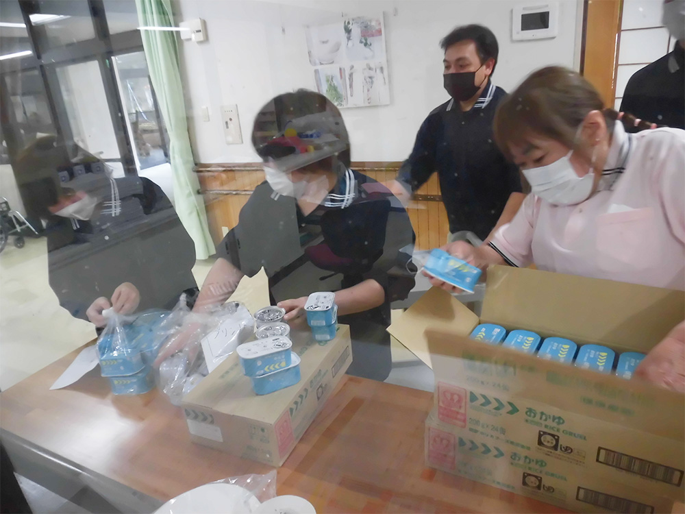 今回は早朝に災害が発生した場合に厨房職員が出勤できない状況を想定して、備蓄食品のみでご利用者へお食事を提供できるかという内容です。